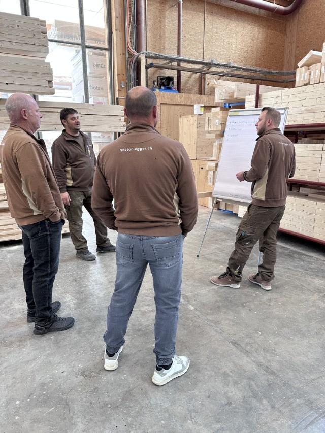 Auch bei der Arbeitssicherheits-Schulung im Holzbau ging es zur Sache: An mehreren Posten wurden unsere Mitarbeitenden gezielt zu unterschiedlichen Gefahrenquellen geschult – direkt an Maschinen, in typischen Alltagssituationen und mit konkreten Massnahmen zur Prävention.